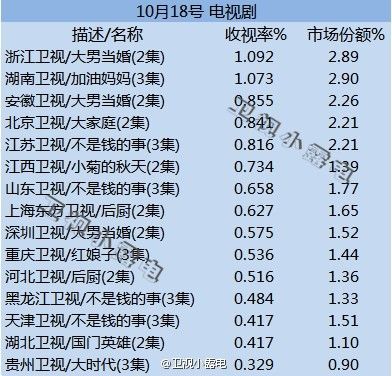 10月18日 csm44 卫视 黄金剧场电视剧 收视 1#大男当婚#(浙江)1.092 2#加油妈妈# 1.073 3#大男当婚#(安徽)0.855 4#大家庭# 0.841 5#不是钱的事#(江苏) 0.816 晚间22:00-24:00时段收视率排名: 1湖南0.588, 2深圳0.554, 3江苏0.545, 4安徽0.463, 5浙江0.434