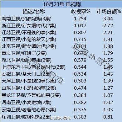 10月23日 csm44 卫视 黄金剧场电视剧 收视 1#加油妈妈#1.254 2#新女婿时代#(浙江)1.107 3#不是钱的事#(江苏) 0.807 4#小菊的秋天#0.715 5#新女婿时代#(北京) 0.704 晚间22:00-24:00时段收视率排名: 1浙江0.585, 2深圳0.569, 3湖南0.512, 4安徽0.379, 5湖北0.375