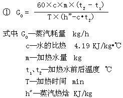 YTW浸没式汽水加热器有额定的蒸汽耗量指标,设计时根据实际所需要的蒸汽耗量,选用一台或多台加热器。实际所需蒸汽耗量可参照以下公式(①用于间断加热,②用于连续加热)确定: