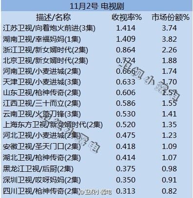 11月2日 csm44 卫视 黄金剧场电视剧 收视 1#向着炮火前进#(江苏) 1.414 2#幸福妈妈# 1.409 3#新女婿时代#(浙江) 0.864 4#新女婿时代#(北京) 0.724 5#小麦进城#(河南) 0.633 晚间22:00-24:00时段收视率排名:1浙江1.601,2深圳0.789,3江苏0.722,4湖南0.717,5上海0.560