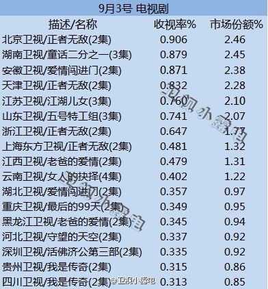 9月3日综述:同样是有关战争的戏,正者无敌明显要比江湖儿女要好看,陈宝国的演技那是胡兵可以比的。有一个预感,正者无敌极有可能演变成第二个亮剑。没有意外的话,这部戏将持续排名第一,同时成就北京青年之后继续播这戏的天津、北京、东方与浙江,而喜欢独播的江苏与湖南接下来估计都没有份。极有可能再次1-4名为正者无故所占据