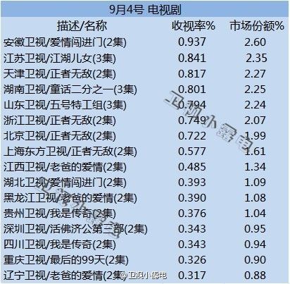 9月4日综述:各大卫视收视率1以下的混战,正者无敌网上竟然有全集,晕!