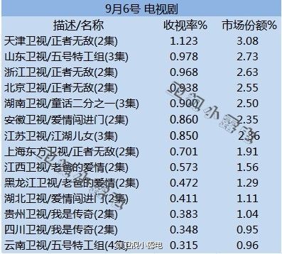 9月6日综述:正者无敌开始上来了,前五中有三,天津卫视是唯一破一的,这个星期前几天卫视全天排名混乱异常,原来的常三甲江苏、湖南、浙江都不在其列。当真开学后变了很多,还是什么的不得而知。奇巧的是浙江卫视既有正者无敌这部电视剧,又有中国好声音这个无敌节目,全天收视一样上不来,倒是天津抢眼的很!