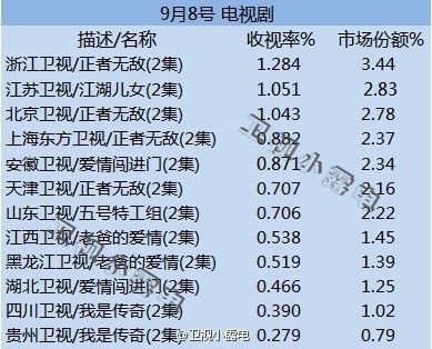 9月8日 csm44 卫视 黄金剧场电视剧 收视 1#正者无敌#(浙江)1.284 2#江湖儿女#1.051 3#正者无敌#(北京)1.043 4#正者无敌#(上海)0.882 5#爱情闯进门#(安徽 )晚间22:00-24:00时段收视率排名: 1江苏2.135, 2湖南1.889, 3浙江0.680, 4上海0.640, 5安徽0.635