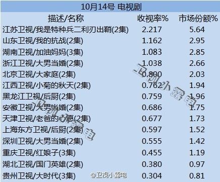 10月14日 csm44 卫视 黄金剧场电视剧 收视 1#我是特种兵二利刃出鞘# 2.217 2#我的抗战# 1.162 3#加油妈妈# 1.083 4#大男当婚#(浙江) 1.038 5#大家庭# 0.800 晚间22:00-24:00时段收视率排名: 1江苏1.977, 2湖南0.728, 3湖北0.514, 4浙江0.443, 5天津0.439